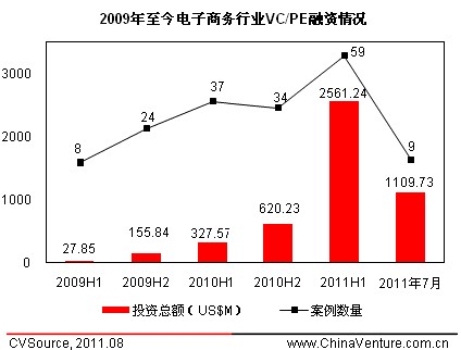 另一方面,目前电子商务行业资本“泡沫”的隐忧,也使第三方服务企业成为PE资本“避险”的选择之一。根据ChinaVenture投中集团旗下数据库CVSource统计,电子商务行业2009年全年披露融资案例32起、融资总额1.84亿美元,随着2010年该行业融资的爆发式增长,2011年前7个月已披露案例68起、融资总额36.71亿美元。平均单笔融资规模更是从2009年上半年的348万美元,上升至今年7月份的1.23亿美元。