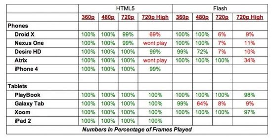 1. Flash性能欠佳。 为移动设备进行优化的Flash知道去年才推出,而且并未给人留下深刻的印象。播放视频的效果还好,但在其他方面就没有什么好说的了。以下是在部分流行机型上HTML5与Flash的一个对比,Flash的掉帧现象明显要严重得多: