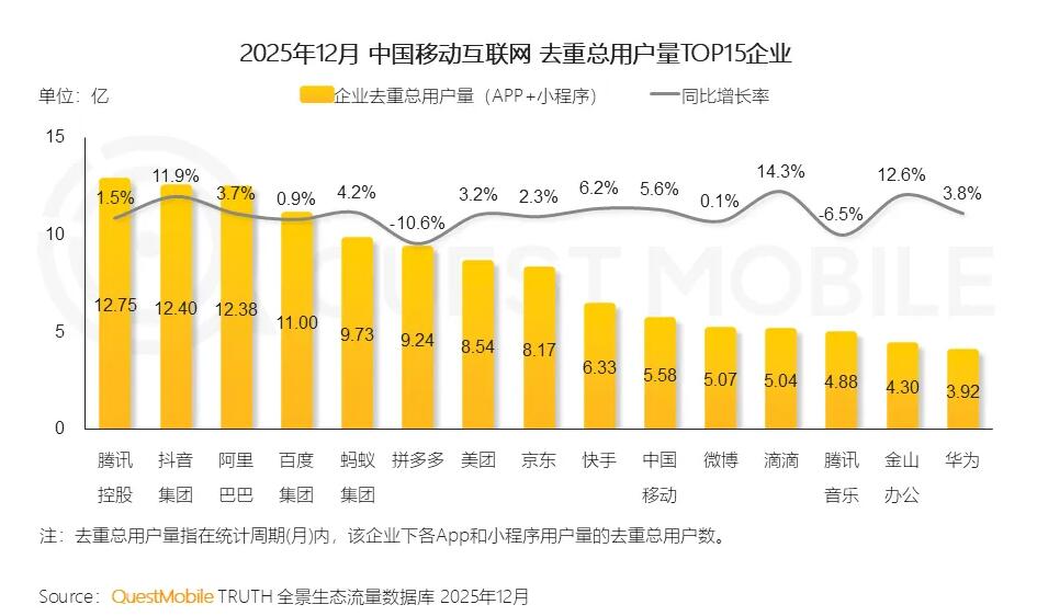 截止2025年12月,腾讯控股、抖音集团、阿里巴巴企业流量均超12亿,滴滴、金山办公、抖音集团等增长显著。