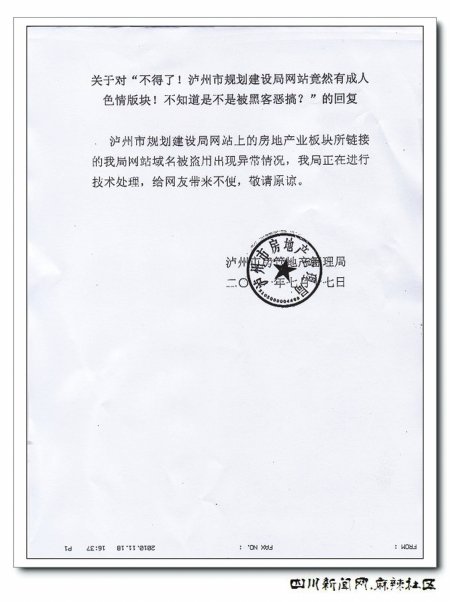 针对此事,记者立即向市住房与规划建设局核实和了解情况。市住房与规划建设局办公室主任肖友权向记者表示,17日,部门网站上确实发生了这样的事情。事情发生后,整个部门领导都相当重视,在事态扩大之前,立即进行了技术处理,并在第一时间和四川新闻网(微博) 、泸州论坛衔接,力求更妥善处理此事。