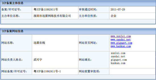 网易科技讯 8月1日消息,7月21日有网易网友发现,迅雷网站(www.xunlei.com)的ICP备案信息不见了。今天网易科技通过查询得知,迅雷的新ICP备案号(粤ICP备11062411号)已经于7月29日通过了工信部备案系统的审核。
