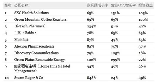 美国医药福利管理公司SXC Health Solutions位列排行榜榜首。过去三年,该公司年均收入增长151%,年均投资收益增长105%。“全球100家增长最快的公司”是《财富》杂志依据各公司过去3年的收入、利润增长,以及投资收益得出的排名榜单。
