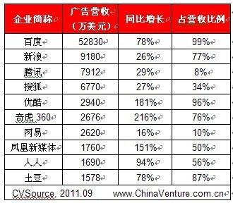 表1 2011年Q2中国互联网公司广告业务营收情况