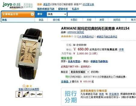 小刘是一位北京一家外企的员工。今年8月,她在卓越亚马逊购买了一款意大利著名品牌ARMANI的石英男表,型号AR0154。