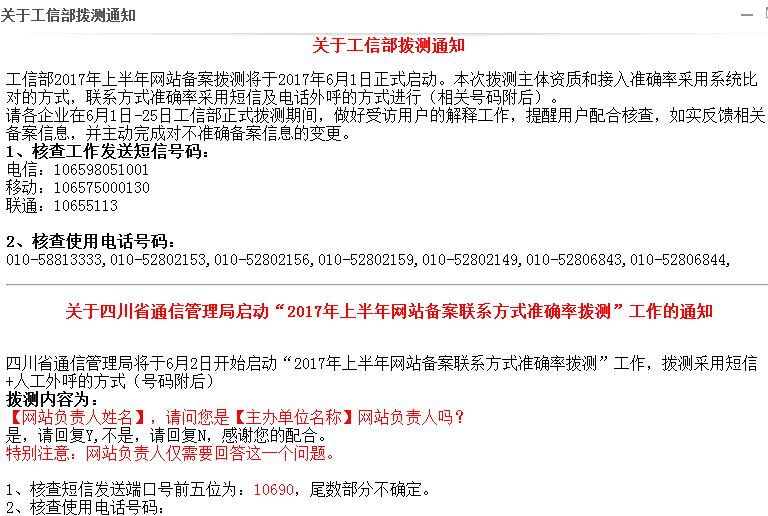 工信部2017年上半年网站备案拔测通知